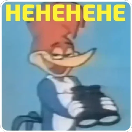 Personagem de desenho animado com bigode e cabelo ruivo, vestido com camisa branca e manga azul, ri com a expressão 'HEHEHEHE'.