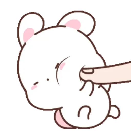 Um desenho de um ursinho branco com orelhas rosadas sendo tocado no focinho por um dedo.