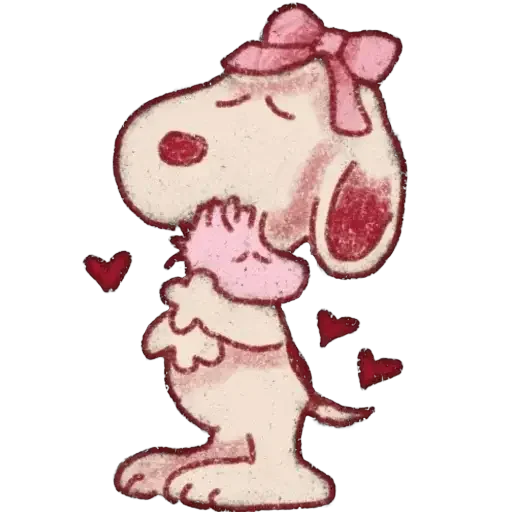 Snoopy e Woodstock se abraçando com corações vermelhos ao redor, Snoopy com um laço rosa na cabeça.
