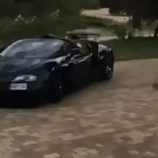 Um carro esportivo preto em uma estrada de paralelepípedos, com uma área gramada e árvores ao fundo.