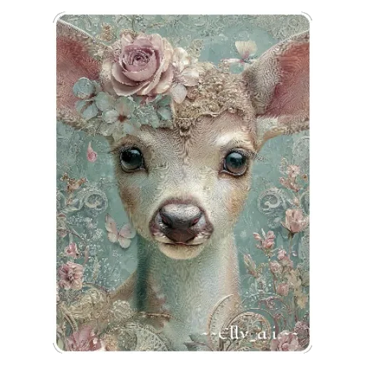 Rosto de uma cerva com flores rosadas e roxas na cabeça, fundo floral.