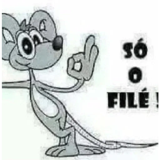 Um rato de desenho animado cinza com expressão surpresa faz um gesto com a mão direita enquanto diz 'SÓ O FILÉ!'