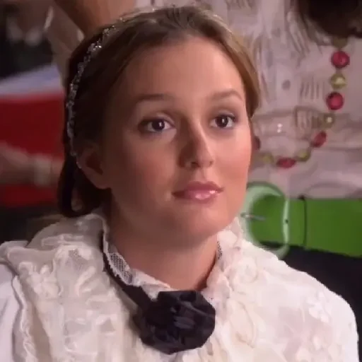 Rosto de uma mulher com expressão de surpresa ou preocupação, usando um laço branco no cabelo.