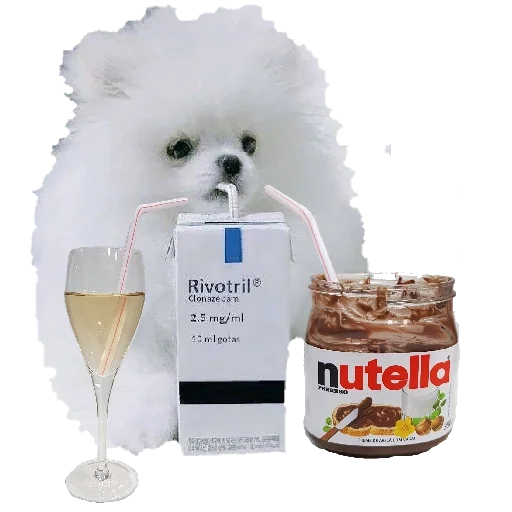 Um cachorro branco fofinho com uma expressão curiosa ao lado de um copo de vinho, uma caixa de Rivitil e um pote de Nutella.