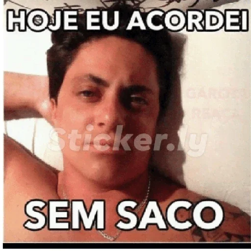 Um homem deitado de lado, com expressão séria e braço atrás da cabeça. Ele tem texto sobreposto: 'HOJE EU ACORDEI SEM SACO'.