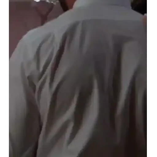 Um homem de costas, vestindo uma camisa cinza, com rugas visíveis no tecido.