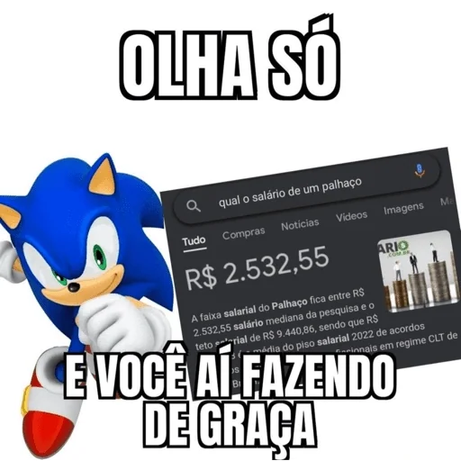 Um meme com o personagem Sonic, mostrando um extrato bancário com um saldo de R$ 2.532,55 e escrito 'OLHA SÓ E VOCÊ AÍ FAZENDO DE GRAÇA'.