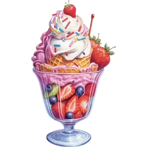 Uma sobremesa colorida em um copo alto, com sorvete branco e rosa, decorado com confeitos, uma cereja no topo e frutas como morangos e mirtilos no fundo.