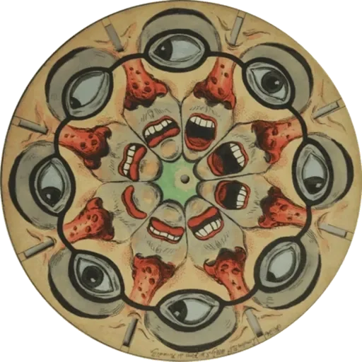 Uma mandala com olhos e bocas abertas em tons de cinza, vermelho e laranja, dispostos de forma simétrica.