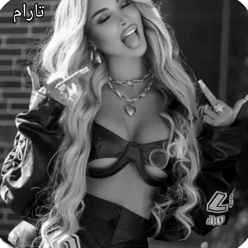 Uma mulher loira fazendo careta e gestos com as mãos. Ela está usando um conjunto de roupas pretas, incluindo um top e uma jaqueta, além de joias como colares e brincos. Há um texto em árabe no canto superior esquerdo.