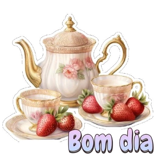 Um bule e duas xícaras de chá com flores e morangos, com a frase 'Bom dia' embaixo.