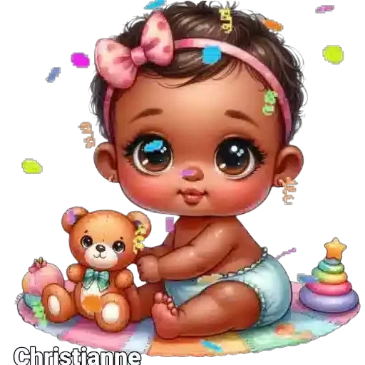 Uma bebê sentada com um ursinho de pelúcia e um bolo de aniversário, usando um laço rosa na cabeça e uma fralda. Confetes coloridos ao redor.