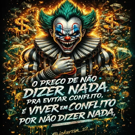 Um palhaço com cabelo verde e maquiagem branca e vermelha aparece com um fundo de chamas e dólares. Abaixo dele, o texto 'O PREÇO DE NÃO DIZER NADA. PRA EVITAR CONFLITO, É VIVER EM CONFLITO POR NÃO DIZER NADA.'