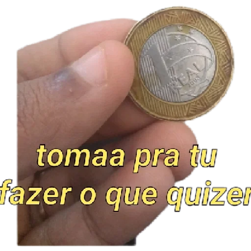 Mão segurando uma moeda de ouro com texto 'tomaa pra tu fazer o que quiser' em amarelo.