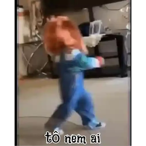 Um menino com cabelo ruivo e macacão azul dançando em uma sala com o texto 'tô nem aí' na parte inferior.