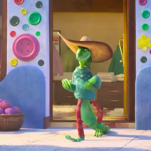 Um lagarto verde usando um chapéu de palha e uma camisa azul, em frente a uma porta com decorações coloridas.