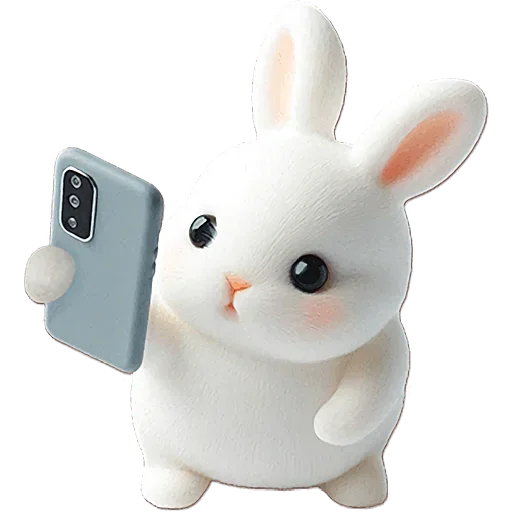 Um coelho branco fofinho com olhos pretos grandes e orelhas rosadas segurando um celular cinza.