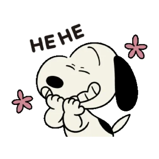 Um desenho do cachorro Snoopy com as mãos no rosto e um sorriso, rodeado de flores rosa e com as palavras 'HE HE' acima.