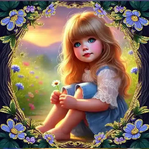 Menina loira sentada em um campo de flores, segurando uma pequena flor, com montanhas ao fundo e uma moldura decorativa de flores.