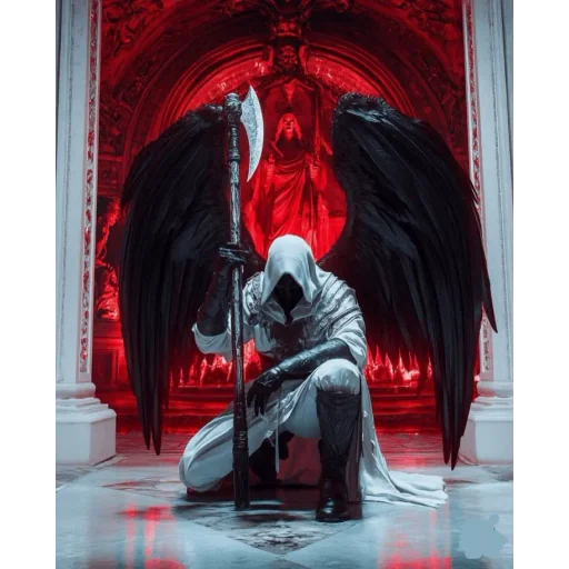 Um anjo da morte ajoelhado com asas negras e uma foice, em um ambiente vermelho e sombrio com detalhes arquitetônicos ao fundo.