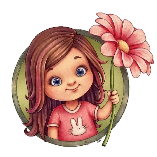 Menina de olhos azuis e cabelo castanho com uma flor rosa na mão e um coelho branco na camiseta rosa.