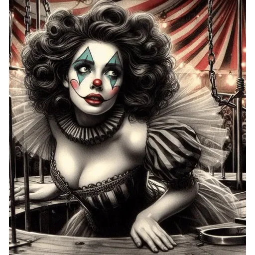 Uma mulher com maquiagem de palhaça, rosto pintado de branco, sobrancelhas escuras e olhos dramáticos, vestindo um traje de palhaça com detalhes em preto e branco, em um cenário de circo.
