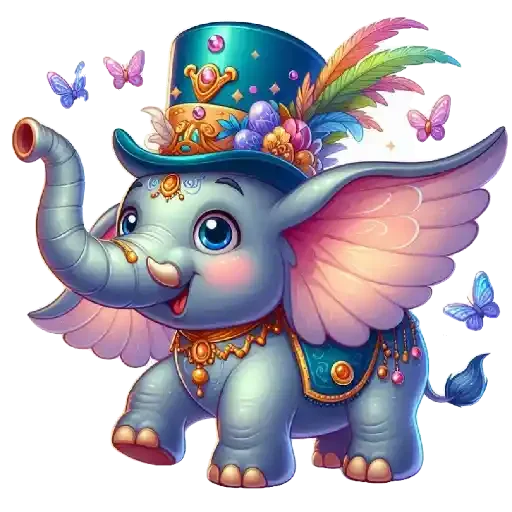 Um elefante cinza com asas cor-de-rosa e um chapéu azul decorado com penas e flores, com expressão feliz e olhos azuis.