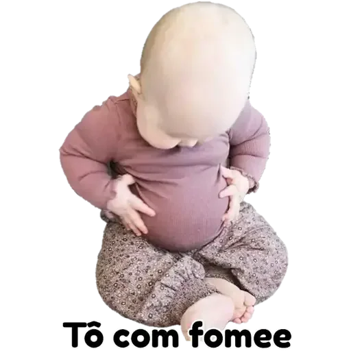 Um bebê careca com uma camisa rosa e calça cinza, sentado com as mãos na barriga e a frase 'Tô com fomee' embaixo.