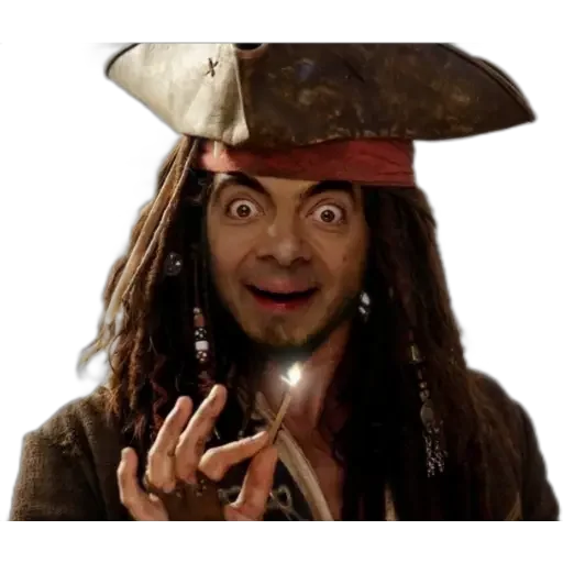 Captain Jack Sparrow com expressão surpresa e mão levantada, usando chapéu de pirata e camisa marrom.