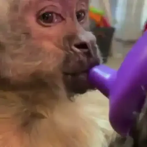 Um filhote de cachorro com pelos castanhos claros olha para o lado enquanto segura um brinquedo roxo na boca.