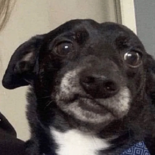 Um cachorro preto com olhos arregalados e uma expressão surpresa, com um pouco de branco no focinho e uma orelha caída.