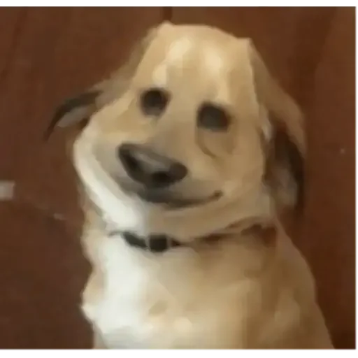 Cachorro branco com colar preto, parecendo sorrir ou mostrando os dentes, contra um fundo castanho desfocado.