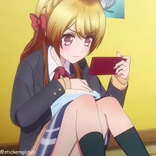Garota de anime com cabelos loiros e um laço vermelho, sentada contra uma parede amarela, olhando para um cartão vermelho. Ela está vestida com um blazer, gravata, saia xadrez e meias longas pretas.