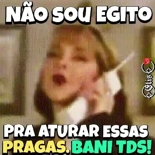 Uma mulher loira ao telefone com expressão de surpresa ou descrença, com legendas 'NÃO SOU EGOITO', 'PRA ATURAR ESSAS PRAGAS, BANI TDS!'