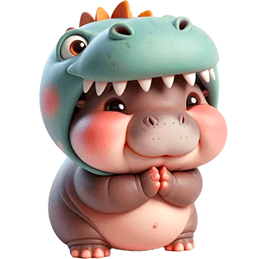Um hipopótamo fofinho com uma cabeça de dinossauro, cor-de-rosa e verde, com expressão fofa e mãos juntas.