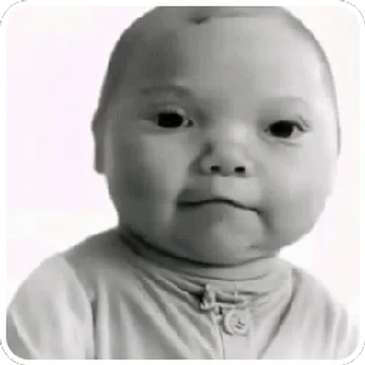 Um bebê com expressão séria, vestindo uma roupa com um botão, em preto e branco.