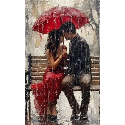 Casal sentado em um banco, beijando-se sob um guarda-chuva vermelho durante a chuva. A mulher veste um vestido vermelho e o homem um casaco preto.