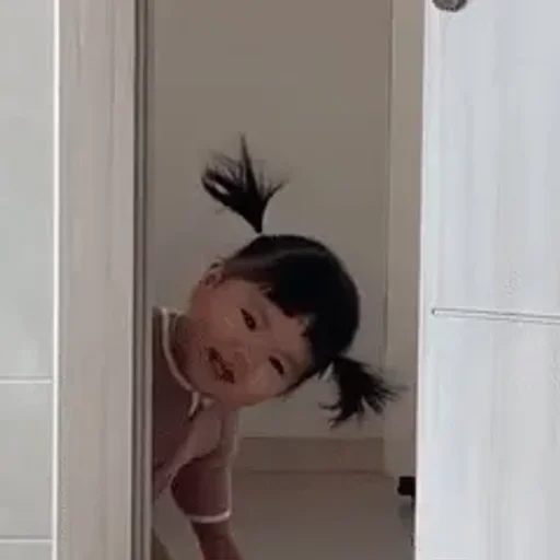 Menina com o cabelo em dois coques, olhando para fora de uma porta, com uma expressão curiosa e um pouco assustada.