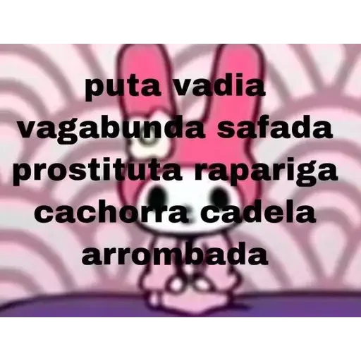 Um desenho de um coelho rosa com orelhas grandes e expressão facial fofa, com texto sobreposto em preto listando palavras ofensivas.