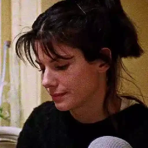 Mulher com expressão séria, olhando para baixo, com o cabelo escuro e uma blusa preta.