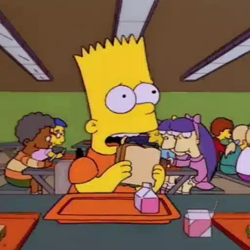 Bart Simpson, com expressão surpresa, segura um papel na escola, possivelmente uma prova ou nota. Ele está em uma sala de aula ou refeitório com outros alunos.