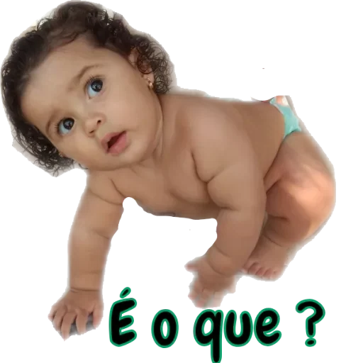 Um bebê deitado de bruços com expressão curiosa, usando uma fralda colorida. Abaixo dele, está escrito 'É o que?'