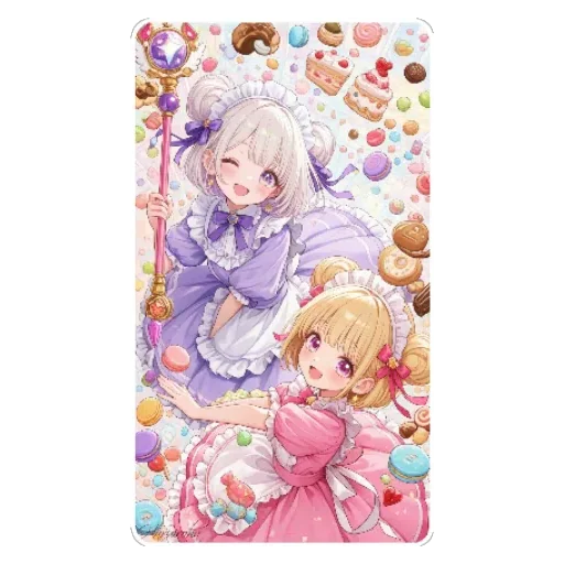 Duas garotas de anime, uma com cabelo branco e vestido roxo, e a outra com cabelo loiro e vestido rosa, em um fundo cheio de doces coloridos.