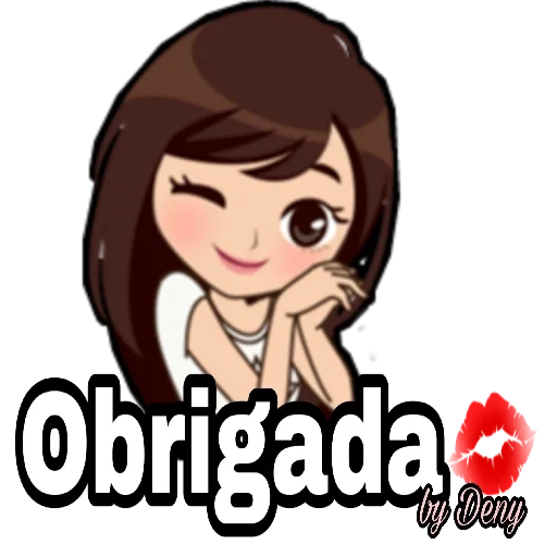 Garota de cabelo castanho com expressão feliz e a palavra 'Obrigada' em destaque.