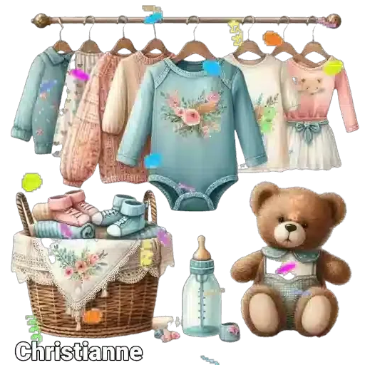 Roupas de bebê penduradas em cabide, com um ursinho de pelúcia, uma cesta de roupas e uma mamadeira.