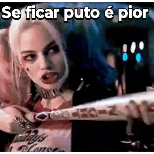 Harley Quinn, com cabelos rosa e maquiagem característica, segura um taco de beisebol com texto. A frase 'Se ficar puto é pior' aparece em cima dela.