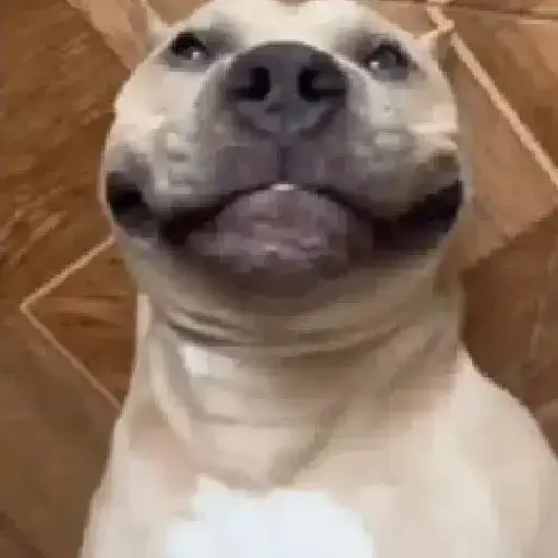 Cachorro com expressão engraçada, mostrando os dentes e com um colar azul.