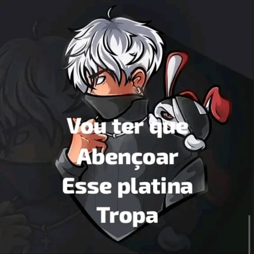 Um personagem de anime com cabelo branco e máscara preta, com um escudo e um coelho ao lado, diz 'Vou ter que Abençoar Esse platina Tropa'.