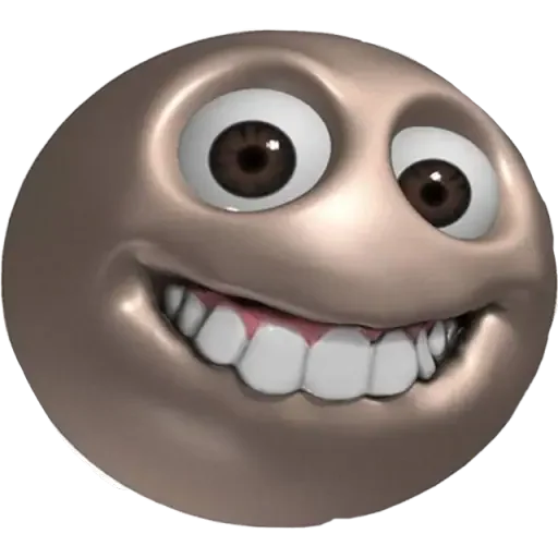 Rosto de uma esfera metálica com expressão de surpresa e sorriso, olhos arregalados e dentes brancos.