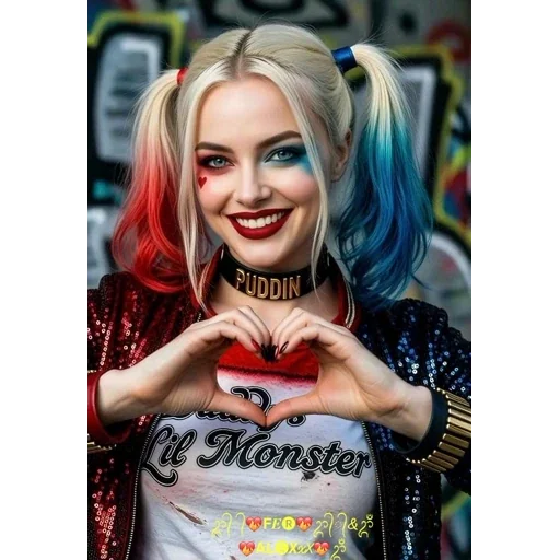 Harley Quinn fazendo um coração com as mãos, com um sorriso, usando uma camisa 'Bad Little Monster' e maquiagem colorida.
